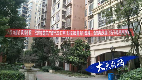 成都商报11月19日报道,“小区内禁止养鸡养狗,已饲养的住户请于2017年11月23日前自行处理,否则相关部门将采取强制措施。”两周前,四川省成都市双流区双桂花园三期挂出了这样一幅横幅。
