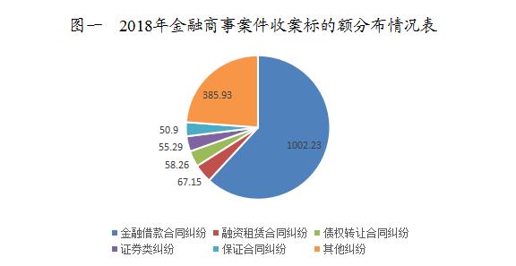 2018年,标的额居前五的一审金融商事案件类型为金融借款合同纠纷、融资租赁合同纠纷、债权转让合同纠纷、证券类合同纠纷、保证合同纠纷,占标的总额的76.17%。(见图一)