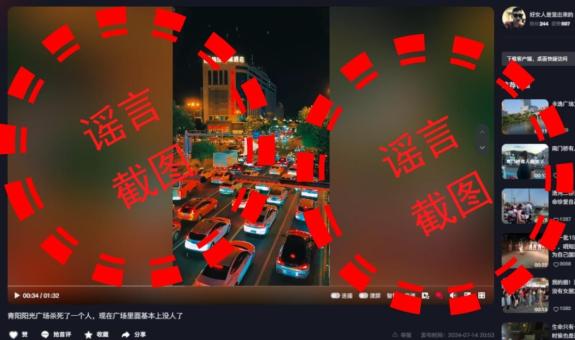 福建泉州网安部门巡查发现,网民陈某付在某短视频平台上发布一段晋江阳光广场夜景视频,配文称“青阳阳光广场杀死一个人,现在广场基本上没人了”,该言论引发网民关注,造成不良社会影响。