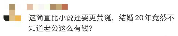但也有人疑惑,“结婚二十年不知道自己的丈夫是富豪?小说都不敢这么写”。