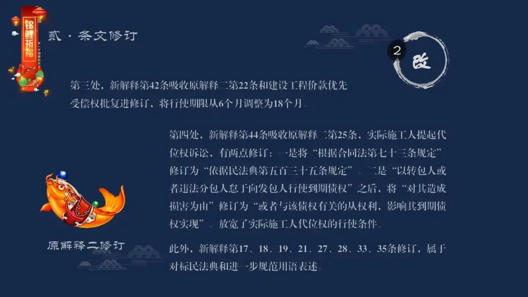 第三处,新解释第42条吸收原解释二第22条和建设工程价款优先受偿权批复进修订,将行使期限从6个月调整为18个月。这是最重要的实质性修订,不再赘述。