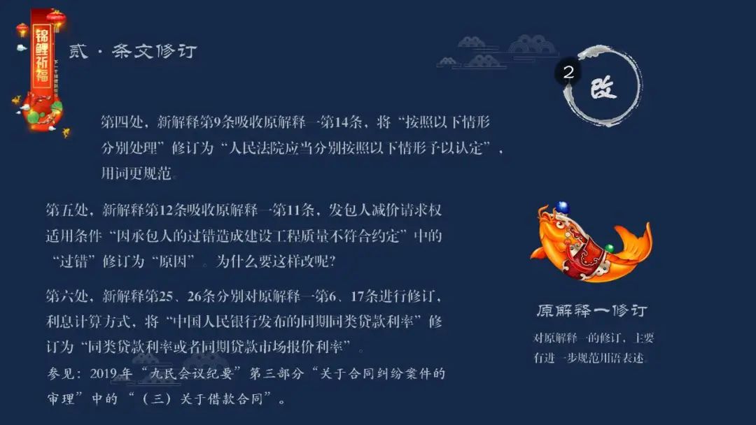 我将与大家分享几条锦鲤,看清条文变化背后不变的精神价值。我从此前建设工程审判实践和学习过程中提炼四条基本原则,根据为四讲。