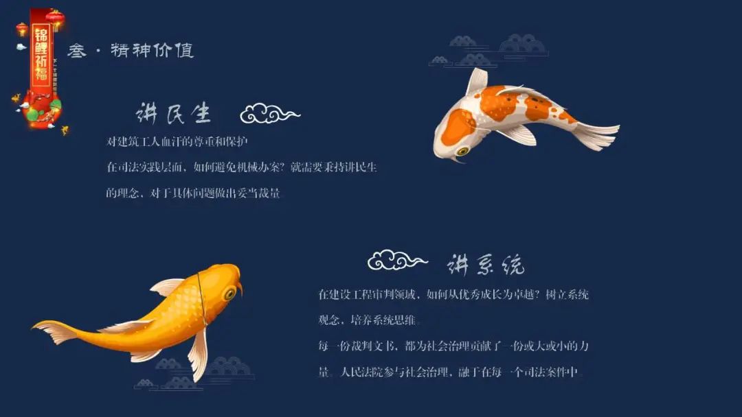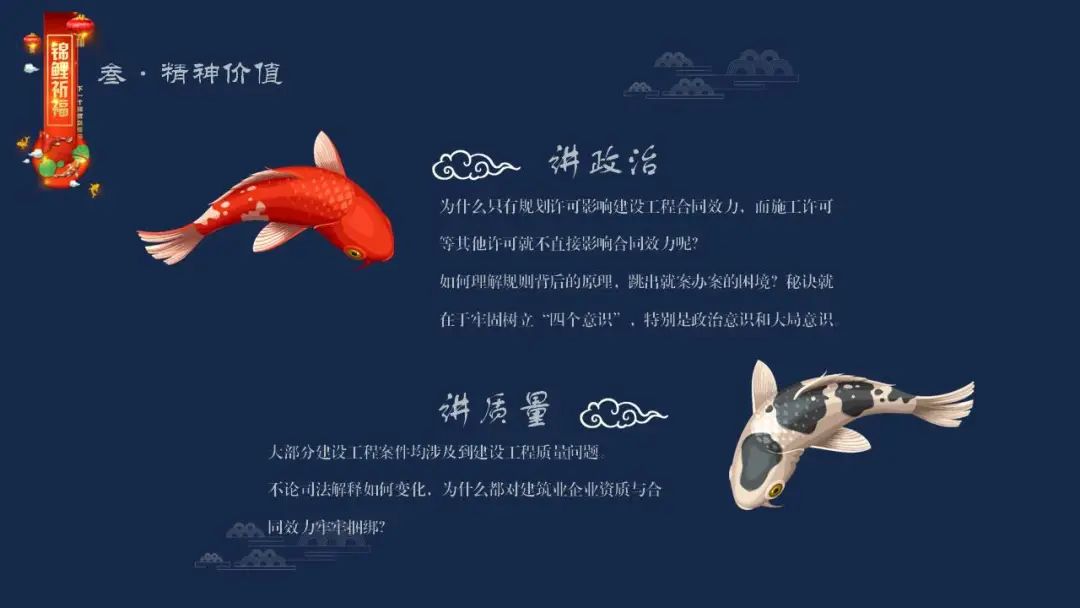第三部分,深入到精神价值层面,洞悉建设工程相关规范的立法目的和法律适用的基本规律,我与大家分享四条锦鲤,讲政治、讲质量、讲民生、讲系统,看清条文变化背后不变的精神价值。