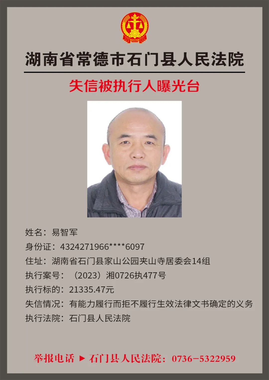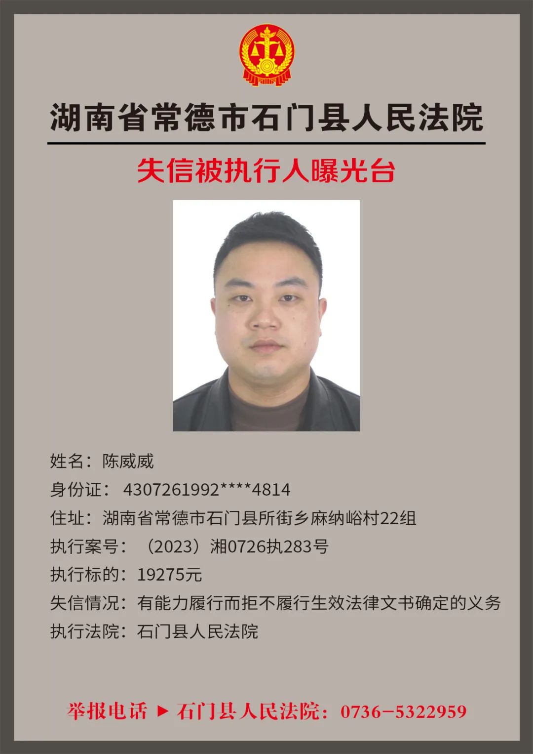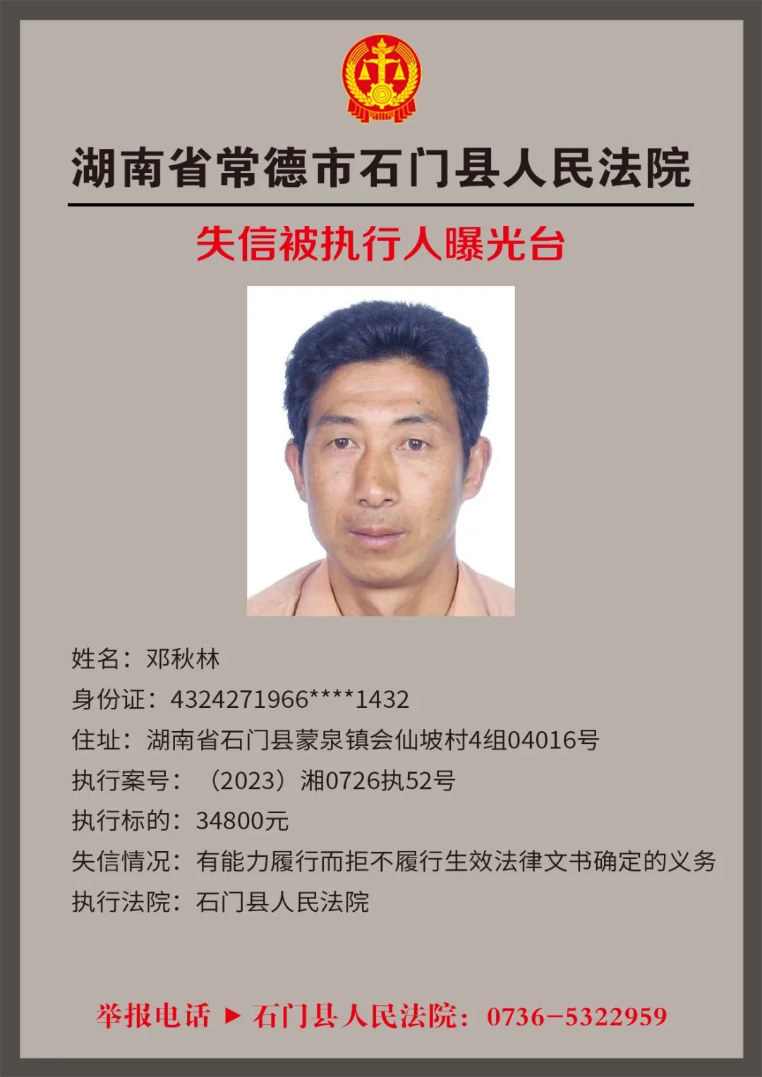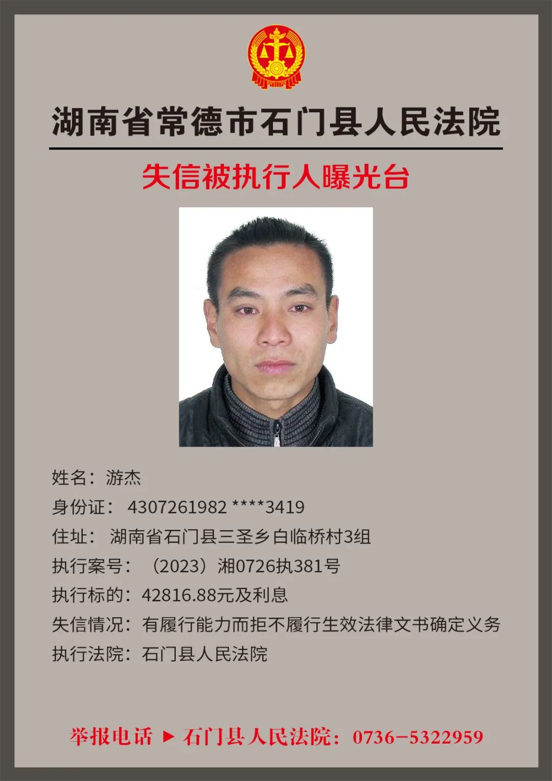 为推进社会诚信体系建设,营造惩戒失信、褒奖诚信的社会氛围,创造稳定、公平、透明、可预期的营商环境,根据《最高人民法院关于公布失信被执行人名单信息的若干规定》,石门法院会相继发布失信被执行人名单,本次为2023年第三轮曝光的失信被执行人,旨在加强对失信被执行人信用监督、威慑和惩戒。