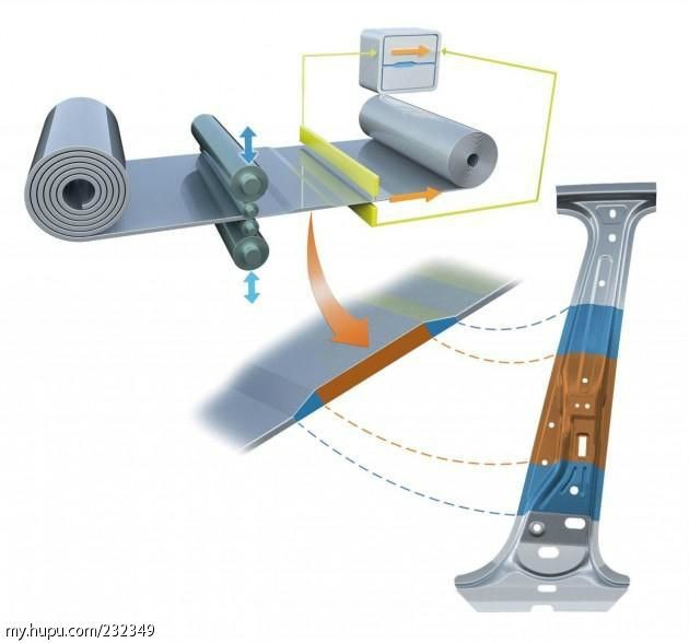这张图是关于B柱加强版的介绍,滚扎变料厚设计(tailor rolled blank)。很好的满足了,不同部分对强度的不同要求。
