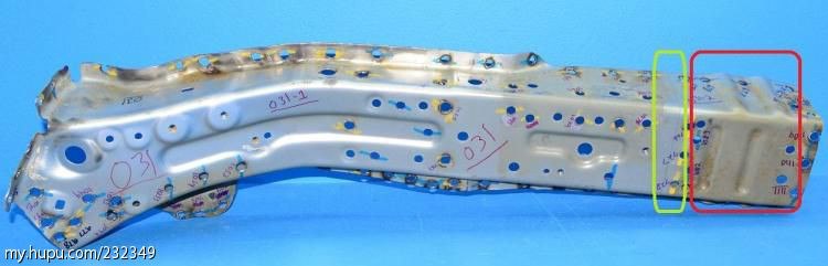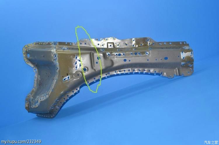 左前纵梁内板,绿圈内隐约可以看到的分界线,这也是一个激光拼焊件。并设计有折弯点。