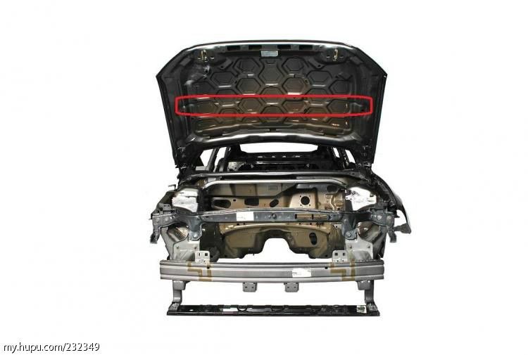 红框内发动机盖的折弯筋,碰撞时使发动机盖折弯。现在很多车型包括德系日系在碰撞不太严重时,发动机盖变形很大就是这个原因。