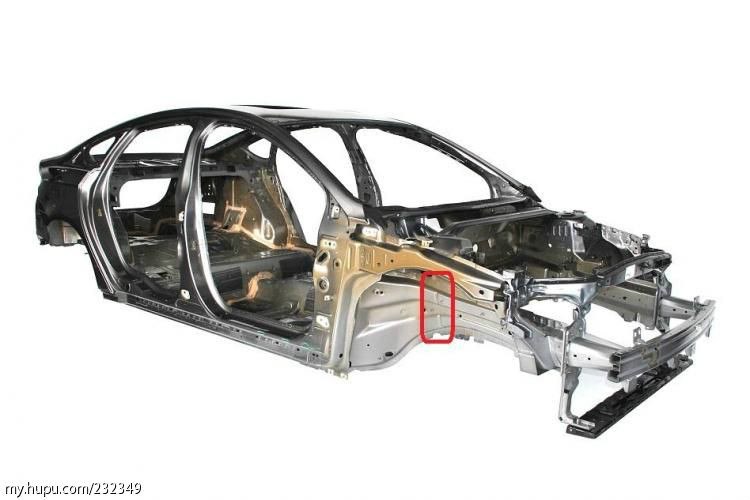 来张整体,注意红框内钣金件上的两个筋。如果我判断正确的话,这就是碰撞时前纵梁的折弯点。