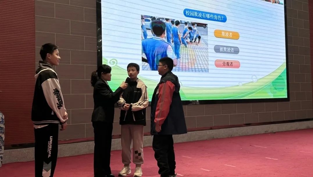 讲座开始,刘云法治副校长便以最近热议的河北邯郸肥乡区初一学生被害案为开端,围绕“什么是校园欺凌?”“校园欺凌有哪些类型?”“校园欺凌的危害有哪些?”“面对校园欺凌怎么办?”等内容,通过PPT、播放短视频、做游戏等方式,让同学们更直观的认识到校园欺凌的危害。讲座结尾,刘云结合电影《第二十条》中的校园欺凌案例,向同学们科普刑法第二十条关于正当防卫的条款,引导同学们敢于向“校园欺凌说不”。