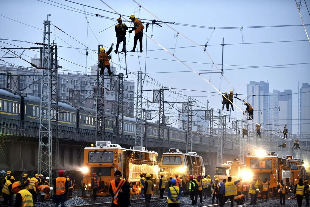 2021年4月12日,在胶济铁路黄台站,中铁十局千余名工作人员经过6个小时的封锁要点施工,圆满完成胶济铁路至济青高铁联络线黄台站改施工作业。 新华社记者 郭绪雷/摄