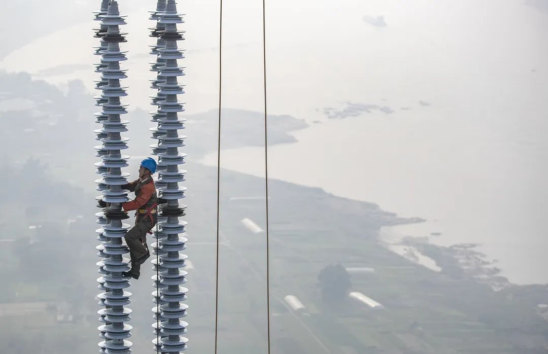 2021年12月5日,在白鹤滩—江苏±800千伏特高压直流输电线路工程(重庆段)江津长江大跨越施工现场,工人在长江上空作业。 新华社记者 黄伟/摄