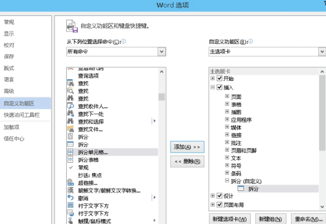 3、Word2013选项窗口中点击【自定义功能区】然后在你要放到工具的主选项卡下面新建一个组。再重命名一下。让你知道这个工具是什么。
