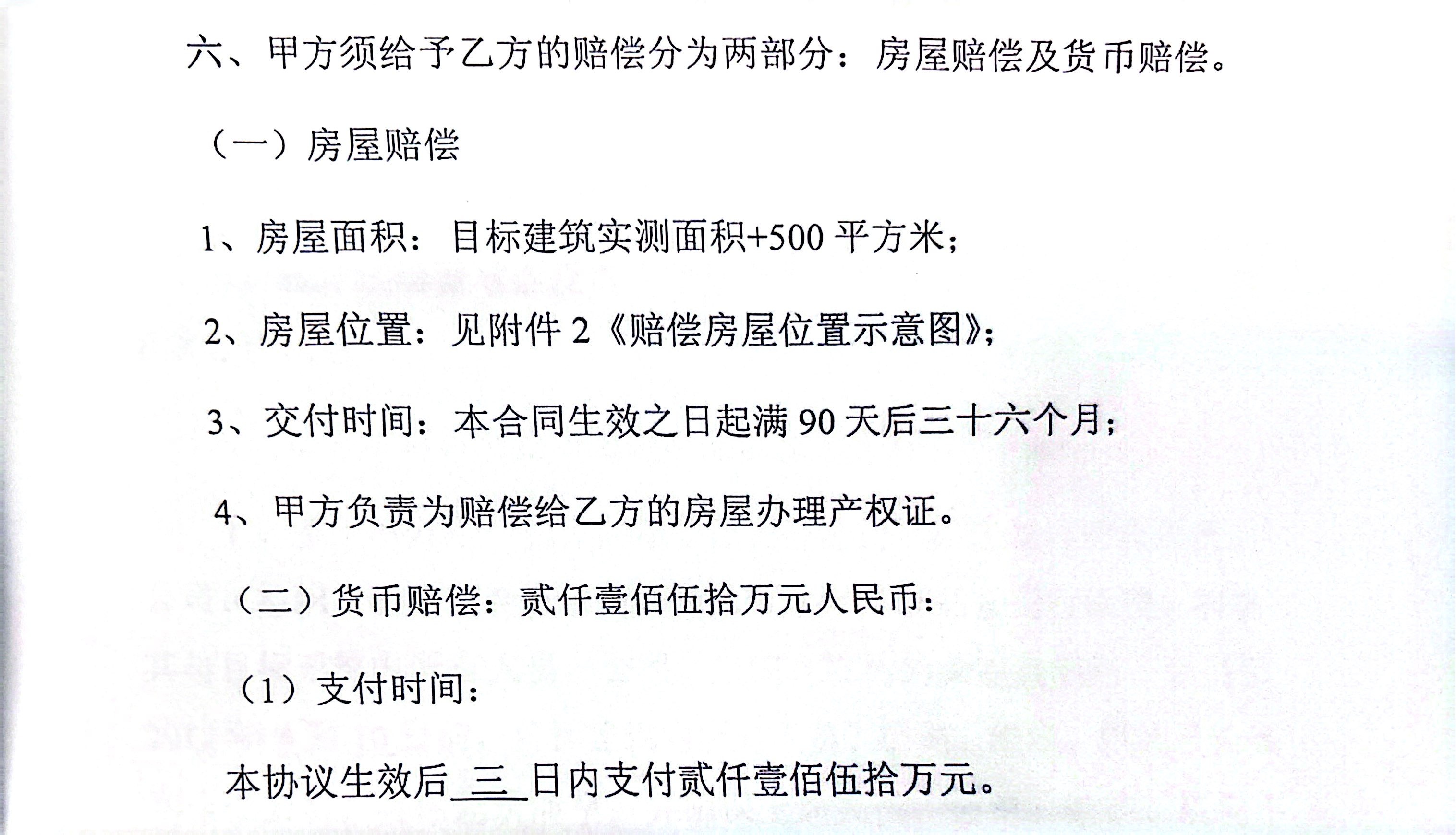 作为补偿,荣康置业将获得2150万元现金赔偿,以及3197平方米的房屋赔偿。