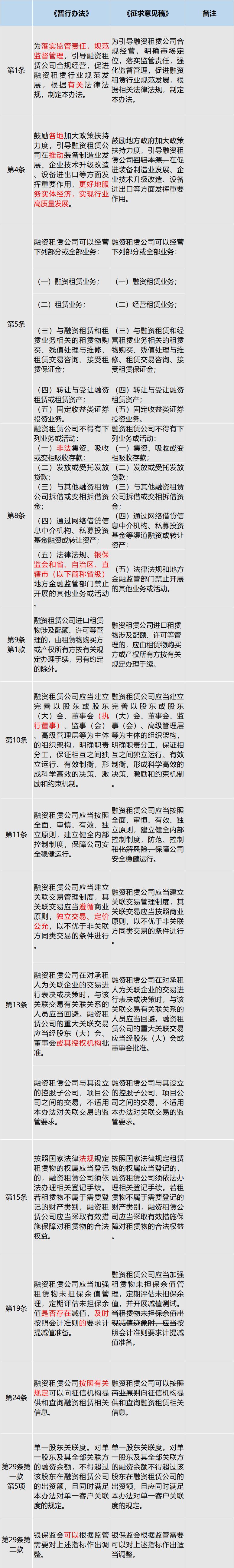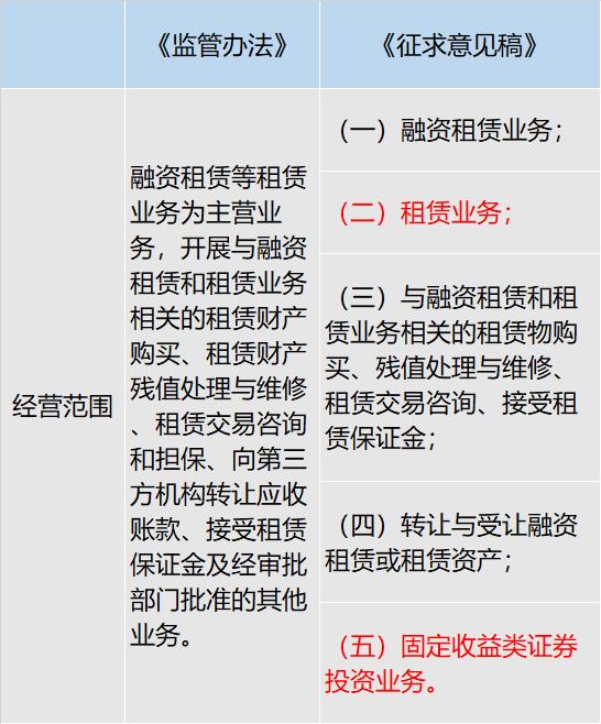 《监管办法》及《征求意见稿》关于融资租赁公司经营范围规定对比如下: