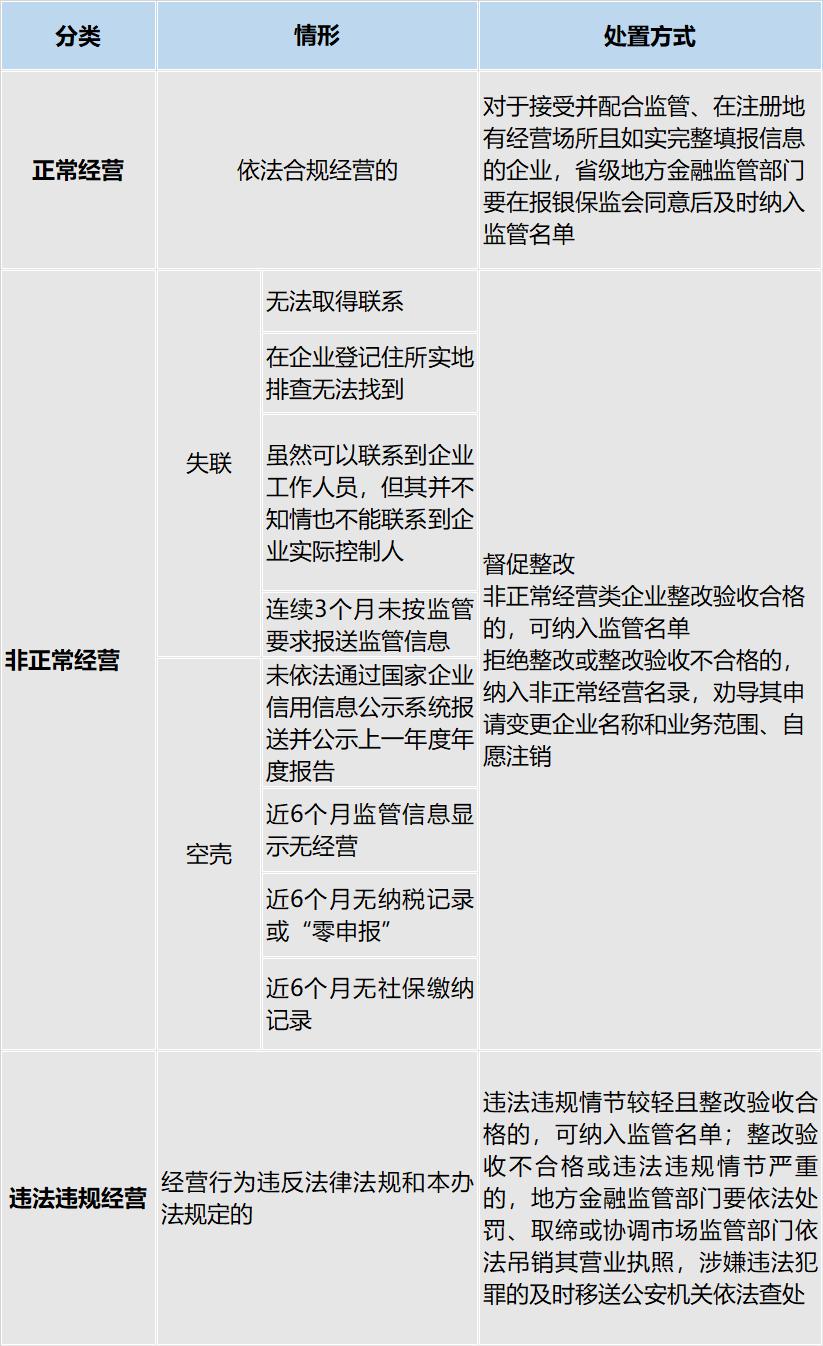 分类监管这个概念早期在P2P核查过程中就有提及,但由于P2P相对复杂的情况并且从是否合规角度定义,较难给到非常明确的标准。银保监会发布的《保理监管通知》中,对于商业保理公司的分类监管提出了较为明确的分类标准,此次《暂行办法》以及之前的《征求意见稿》也采用对应的标准。2020年5月8日发布的《中国银保监会办公厅关于加强典当行监督管理的通知》(以下称“《典当监管通知》”)也规定了“失联”、“空壳”的认定标准。笔者认为在后续修订《典当管理办法》也会采用分类监管,并对典当的分类标准进一步细化。