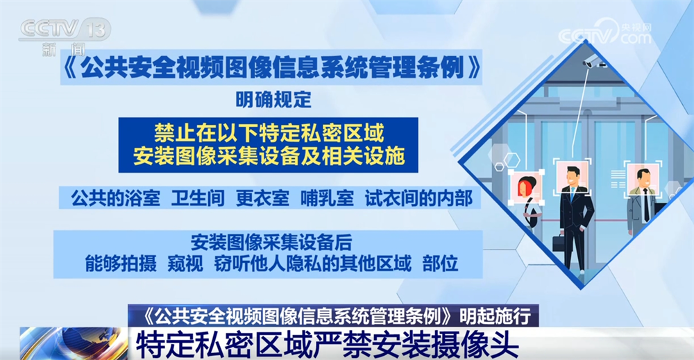 值得注意的是,条例特别划定了图像采集设备及相关设施“禁止安装的区域” ,那么哪些公共区域禁止安装?偷拍乱象又该如何整治?针对这些社会广泛关注的问题,《条例》进行了明确。