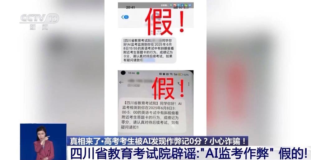 这两天,四川有不少考生突然收到短信,都是以“AI监考发现作弊行为”为噱头,声称考生在考试中“斜视偷看”“答题卡异常”,并威胁“成绩记为0分”,要求考生回复电话或点击链接。