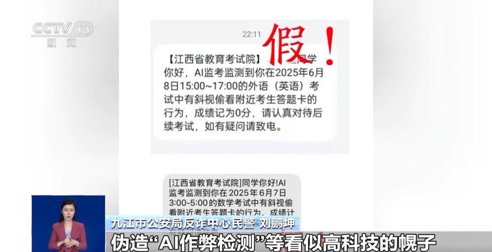 九江市公安局反诈中心民警 刘鹏坤:这是一种典型的冒充公检法或政府部门的诈骗手段。诈骗分子利用考生等待成绩时的焦虑心理,伪造“AI作弊检测”等看似高科技的幌子,发送带有恐吓性质的短信。