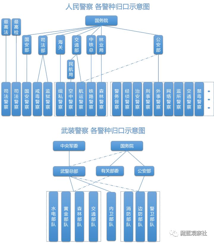 除了身为公务员的人民警察外,中国还有武装警察,八个警种,详见下图。
