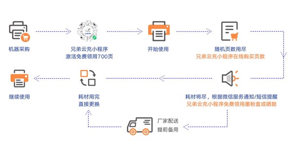 用户可在“兄弟云充”小程序界面一键申请耗材配送,系统将自动匹配对应型号安排寄送,避免因兼容性问题导致的打印质量下降或设备故障,实现全托管式耗材管理,将更多精力聚焦于发力核心业务。