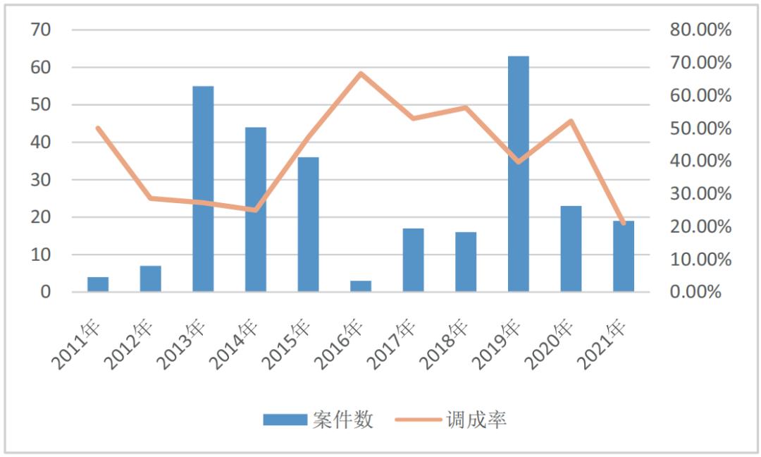 在全部案件中,调解成功的共有110件,调解成功率为36.30%。近年来,委托调解的年度调解成功率较机制创设之初有显著提高,其中2016年达到委托调解成功率最高值,为66.67%。案件调解成功率总体呈稳步趋势,2016年-2020年委托调解的案件成功率相较2011年-2015年实现了从32.19%到41.28%增长,反映出委托调解机制成效有了明显提升。