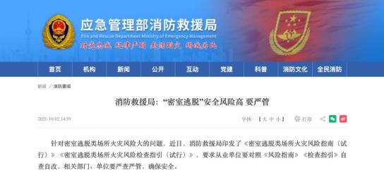 针对密室逃脱类场所火灾风险大的问题,近日,消防救援局印发了《密室逃脱类场所火灾风险指南(试行)》《密室逃脱类场所火灾风险检查指引(试行)》,要求从业单位要对照《风险指南》《检查指引》自查自改,相关部门、单位要严查严管,确保安全。