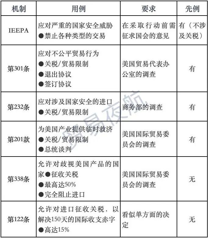 总统需宣布国家紧急状态或引用IEEPA。过去四年有12项紧急声明和34项行政命令引用IEEPA。无需调查期,但可能面临法律斗争。(原创 船长 贸易夜航)