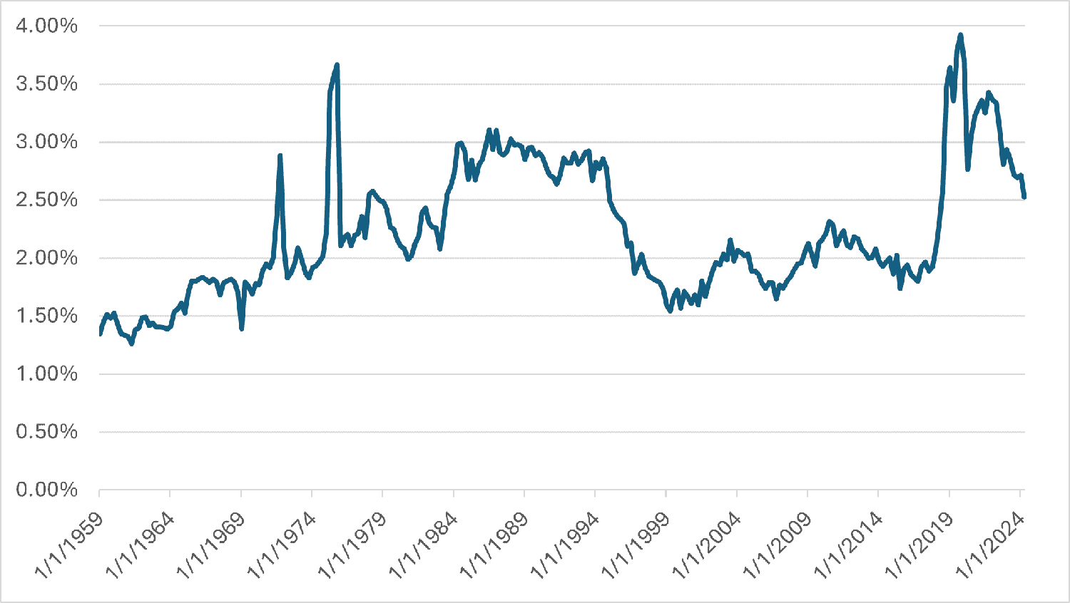 海关关税收入在过去一个世纪中都不是美国重要的收入来源,2024年第二季度,美国的关税收入仅占其总收入的2.5%。回顾过去60年的历史,关税收入占比的最高点出现在2019年,占比接近4%。