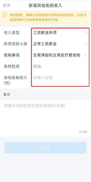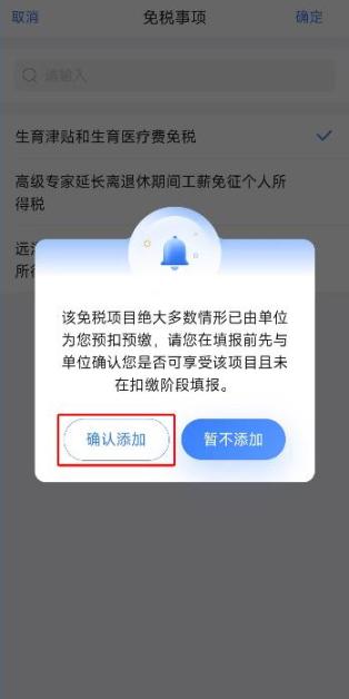 第3步:免税事项选择“生育津贴和生育医疗费免税”,确认单位并未申请免税则点击确认添加,填入生育津贴金额。