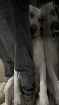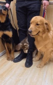 大金毛看到有小朋友上电梯,赶紧把头藏在主人裤裆下面,生怕吓到人家。