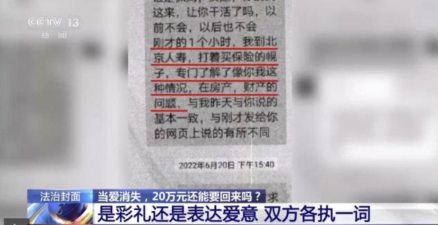 北京市大兴区人民法院法官 彭珍珍:比如刘先生为了打消何女士的顾虑,跟何女士发了一些说去咨询了一些法律的专家,或者看到了一些法律的文章,里面说的是二婚的妻子,对于二婚的配偶的财产也是享有继承权的。微信很明显是在打消何女士对于他们二婚之后,她继承不了何刘先生财产的疑虑,包括刘先生多次表示想要跟她共同生活,并且说要为他们俩的共同生活要去装修一套房子,结合他们双方有结婚的意愿,所以我们就认定20万元是彩礼。