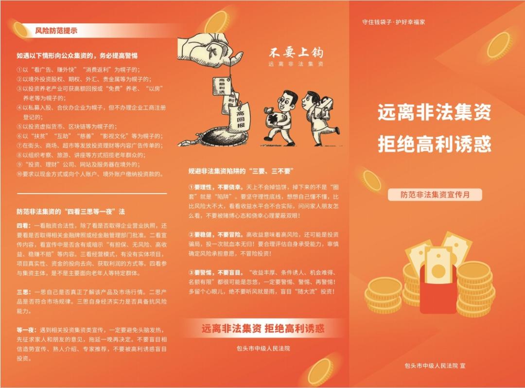 为深入贯彻全国防范非法金融活动宣传月工作要求,提升群众风险防范意识,保障合法经济利益,维护市场经济秩序,6月24日,包头中院开展“守住钱袋子,护好幸福家”主题宣传活动,通过线上线下融合的宣传方式,推动防范非法集资知识深入人心。