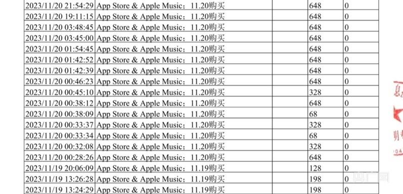 从刘先生提供的消费电子账单来看,仅2023年11月20日一天,App Store & Apple Music中共有15笔消费,其中有10笔消费每单为648元,另有3笔328元的消费和2笔68元的消费。