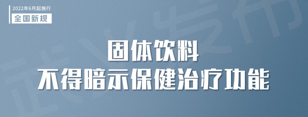 《关于加强固体饮料质量安全监管的公告》6月1日起正式实施,明确固体饮料标签、说明书及宣传资料不得使用文字或者图案进行明示、暗示或者强调产品适用于未成年人、老人、孕产妇、病人、存在营养风险或营养不良人群等特定人群,不得使用生产工艺、原料名称等明示、暗示涉及疾病预防、治疗功能、保健功能以及满足特定疾病人群的特殊需要等。