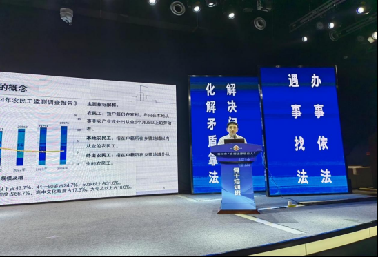 为了助力利川市该项目实施,6月10日,胡可副教授还带着“外卖骑手权益谁来保?”“灵活就业者工伤怎么赔?”等问题,以《农民工、新就业形态劳动者权益保护暨法律援助知识》主题,为利川市的56名“法律明白人”骨干进行了专题授课,为培育供给法治人才队伍夯实了基础。