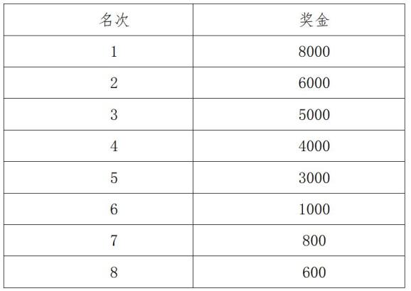 1.女子半程马拉松个人组分别录取前8名,前8名分别获得奖金(单位:元,奖金需征收20%的个人所得税,见下表),前三名颁发奖杯一座,完赛牌一枚。前三名取枪声成绩,4-8名取净计时成绩。