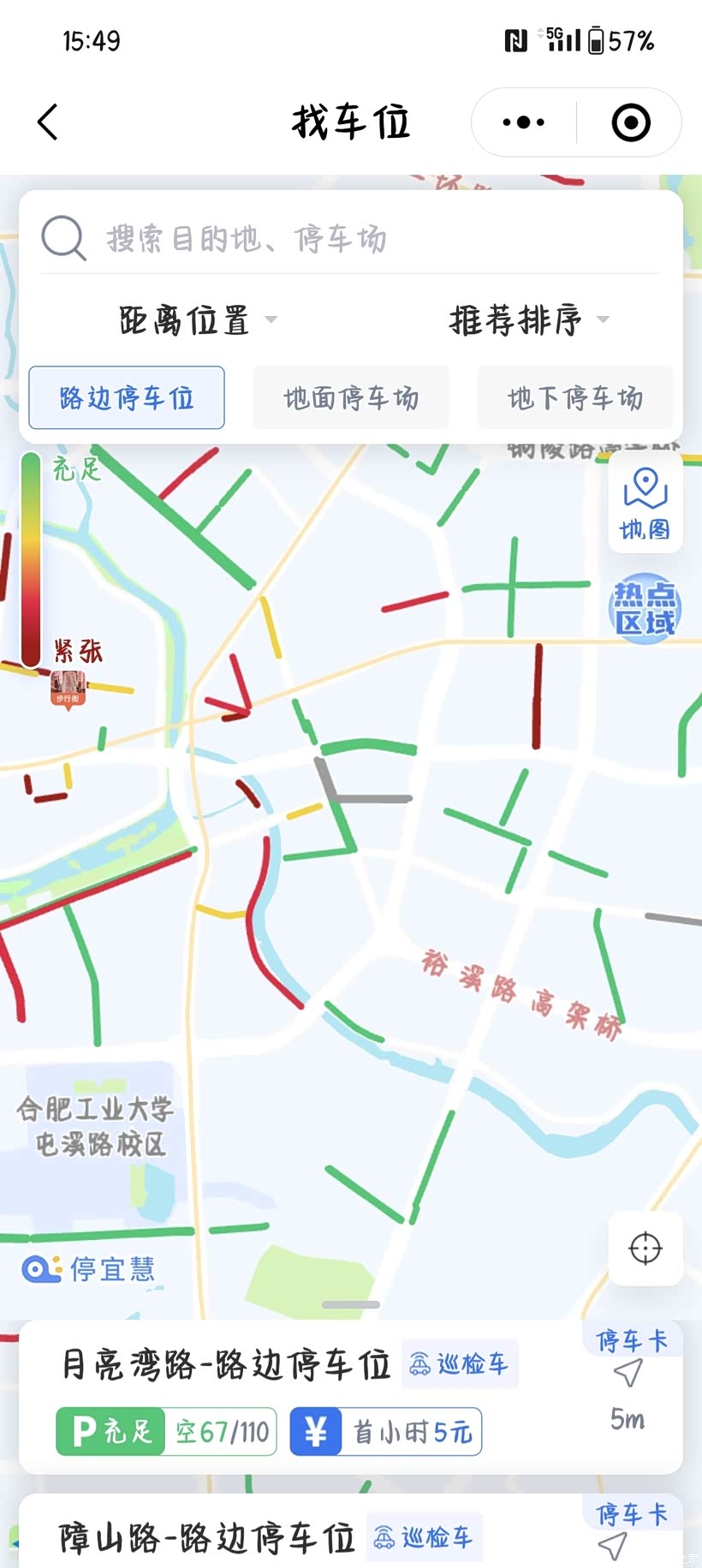 目前在市区商圈周边主干道,以及不影响车辆通行的小区周边道路,都有路边划线泊位,而且通过合肥城泊公司推出的停宜惠app,可以实时查看需要前往目的地是否有空余车位,红色就是满员,绿色说明还有空位。