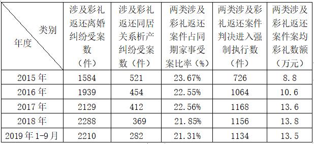 (一)2015年以来彩礼案件状况表1:商丘两级法院2015年1月-2019年9月婚约财产纠纷案件基本情况