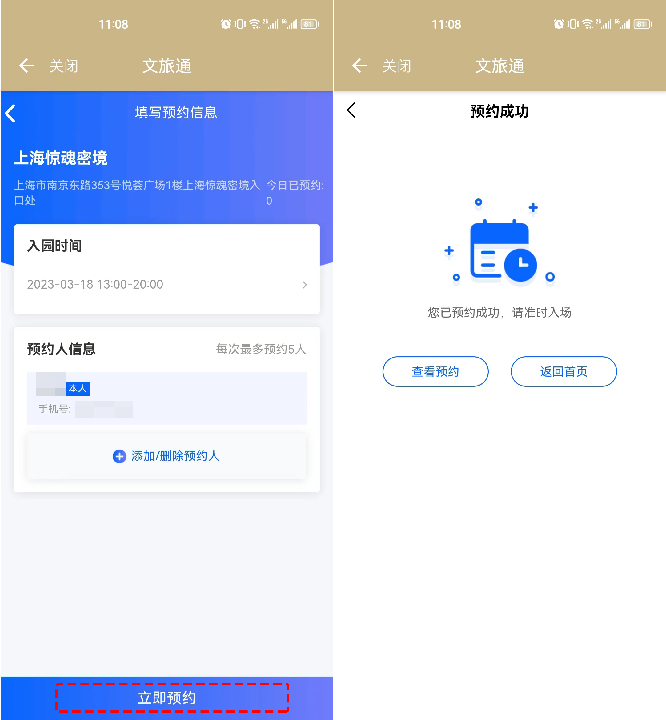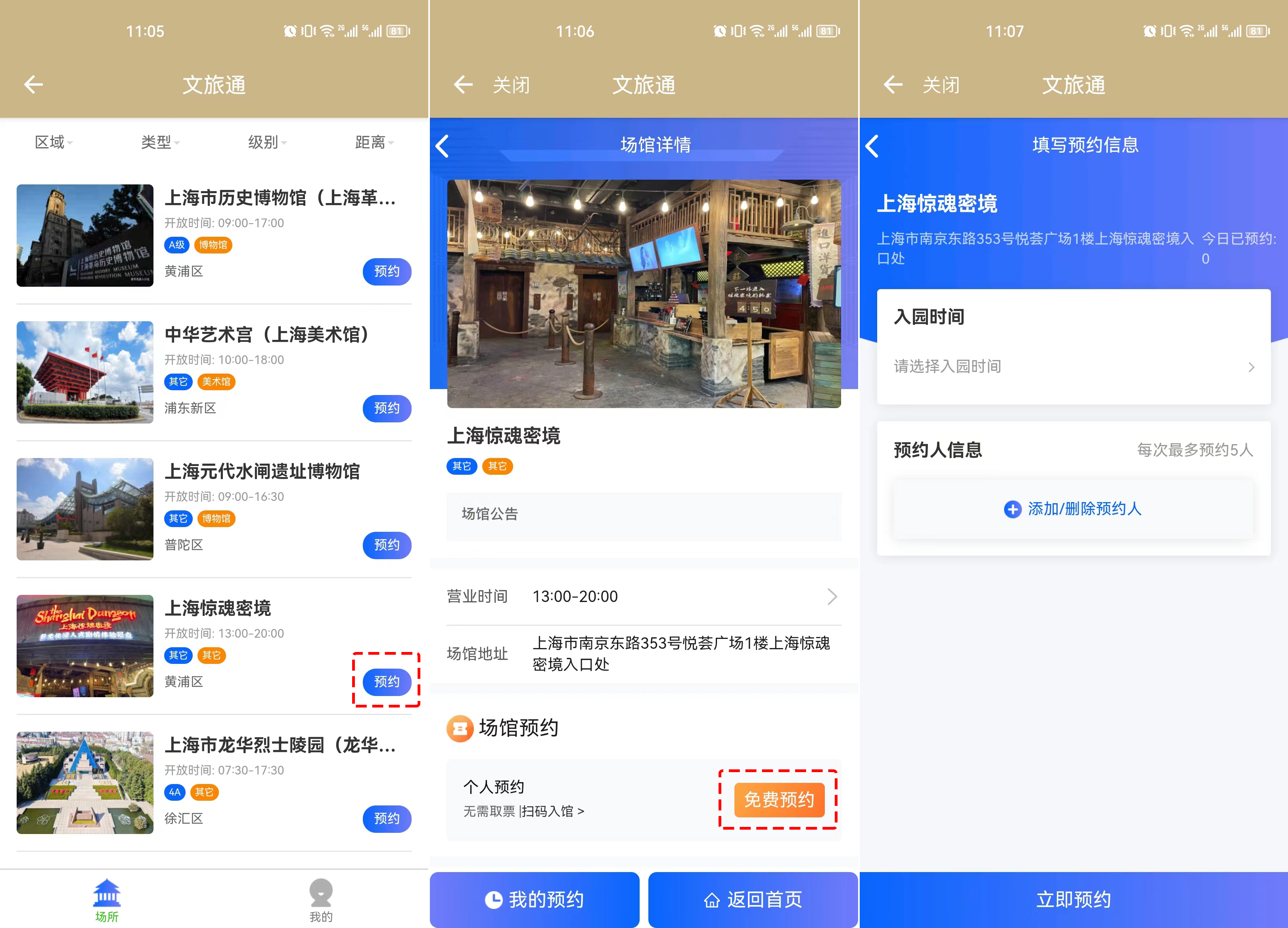 点击景点/景区的“预约”键(以上海惊魂密境举例)→点击“免费预约”→选择入园时间和预约人信息