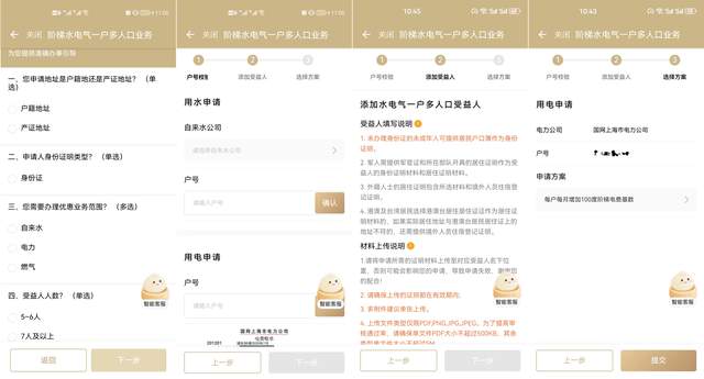 根据页面提示,在线填报用水、用电、用气申请户号、业务申请人、受益人、选择方案等信息,提交后即完成申报。