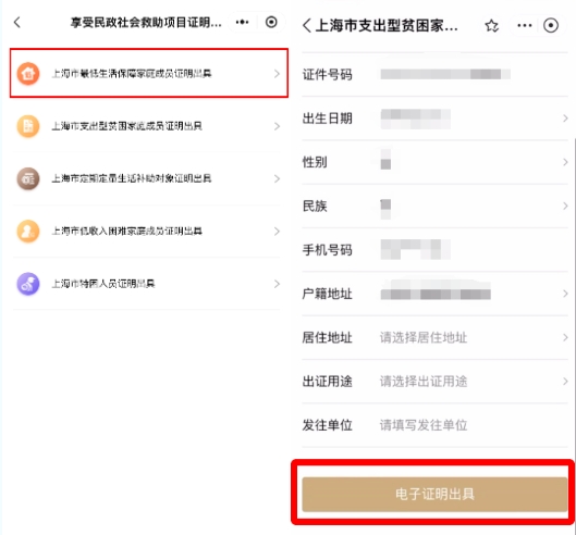目前上海市最低生活保障家庭成员证明、支出型贫困家庭成员证明、定期定量生活补助对象证明、低收入困难家庭成员证明、特困人员证明等5项民政社会救助项目证明,已全部实现电子证照制发和数据共享,一键“亮证”,轻松办理相关事项!