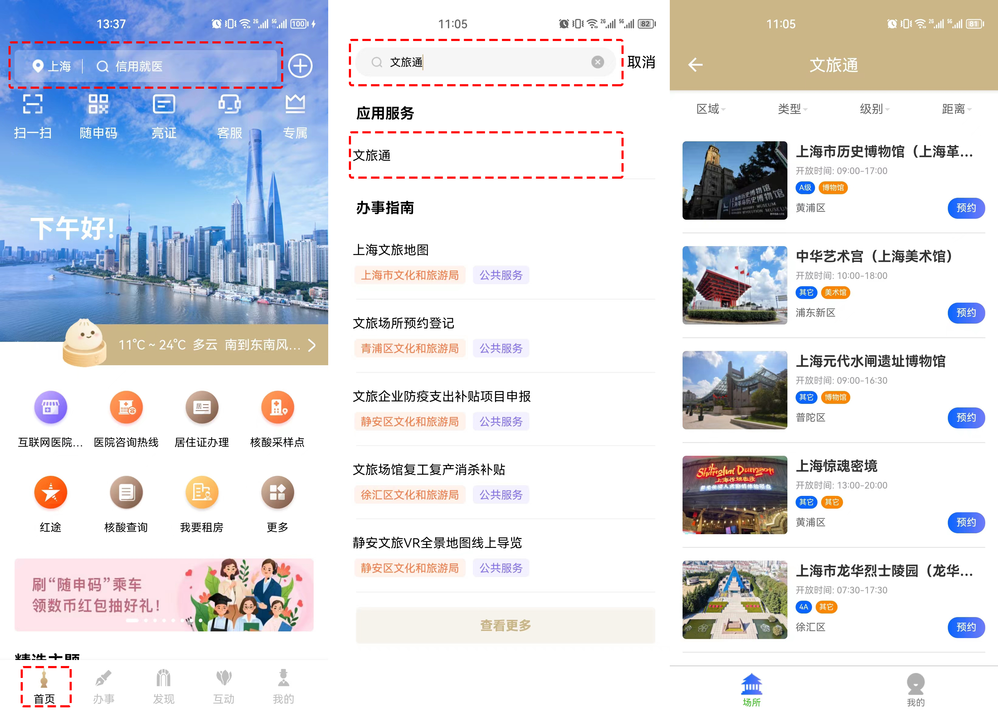 登录“随申办市民云”APP→首页搜索框中输入关键字“文旅通”→点击“文旅通”进入服务页面
