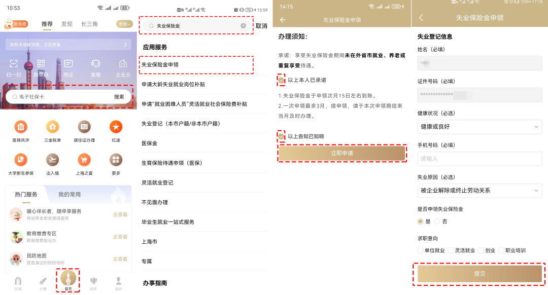 符合申请条件的申领人,完成“失业登记”后,可通过“随申办市民云”APP线上提交申请,操作步骤如下↓