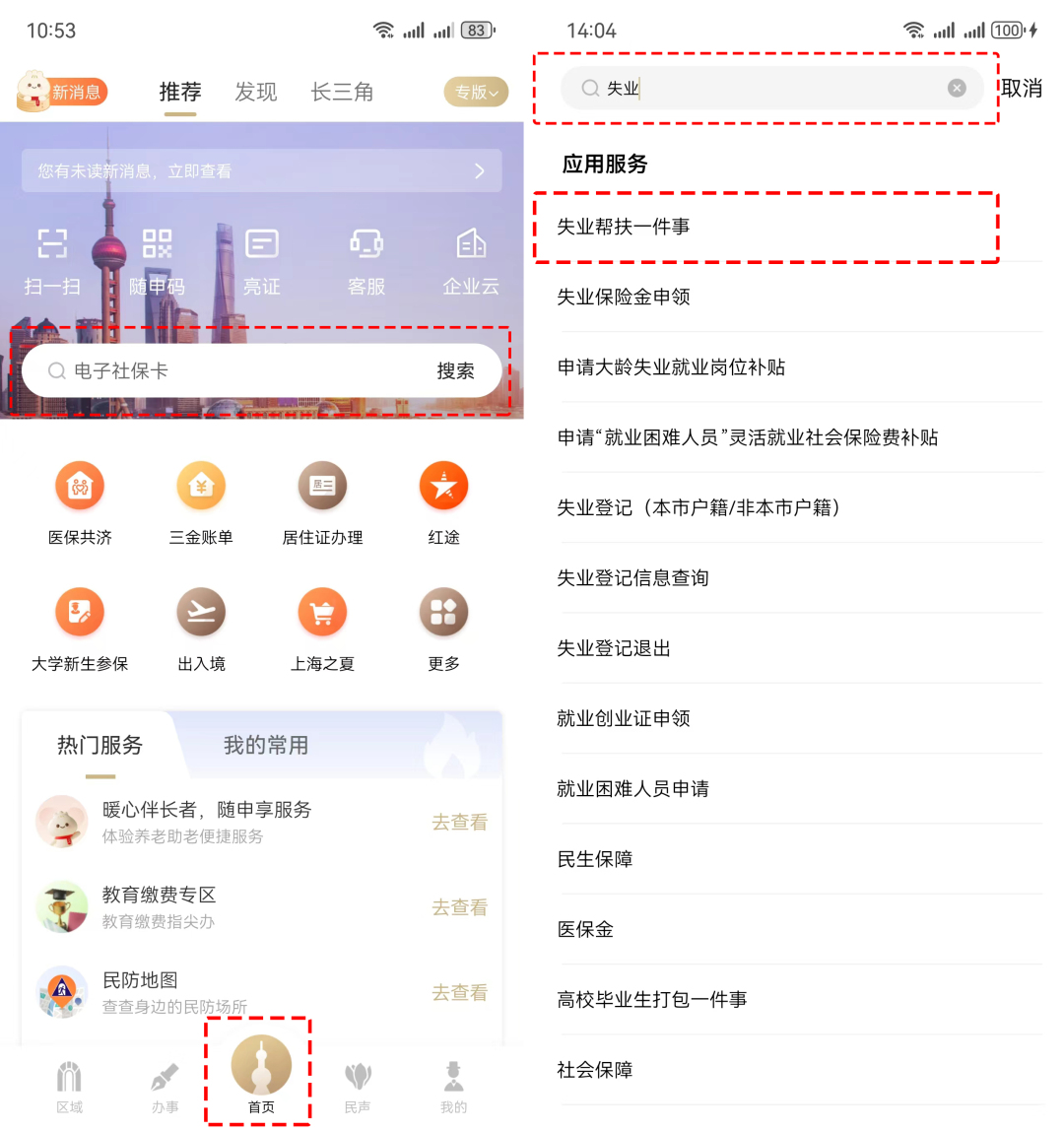 打开“随申办市民云”APP→首页搜索框中输入“失业”→点击“失业帮扶一件事”进入服务页面;