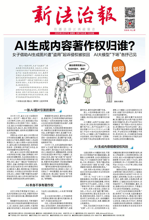 输入一段提示词,点击“生成图片”,精美的图片便呈现在眼前。生成式人工智能(AI)在为人们生产生活带来便利的同时,也会产生一些法律方面的风险。近日,鹰潭市月湖区人民法院审理了一起因使用AI生成图片引发的著作权侵权纠纷。法院经审理认为,由AI软件“一键生成”的图片缺乏人类独创性智力投入,不属于著作权法保护的作品,驳回原告诉求。