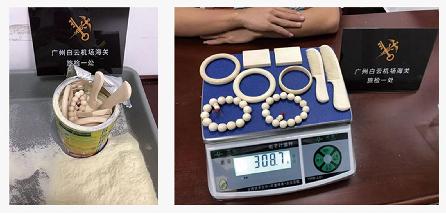 该名旅客抵达后提取了目标行李箱,通过无申报通道入境,值班关员立即对其行李箱实施开箱查验。经查,在其行李箱中有一个已开封奶粉罐,将奶粉倒出后,内藏有象牙手链、手镯、梳子等国家禁止进境的濒危动物制品。事实面前,该名旅客如实交待了其藏匿携带禁限物品入境的违法行为。