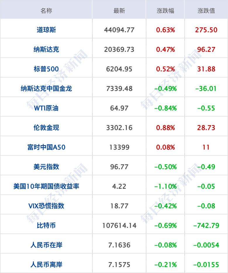 美股三大指数集体收涨,道指涨0.63%,纳指涨0.47%,标普500指数涨0.52%,纳指、标普均创历史收盘新高;科技股集体上涨,微软、Meta、奈飞均小幅收涨并创盘中历史新高,苹果收涨2%;Robinhood收盘上涨13%,创下4月9日以来的最佳单日表现。中概股涨跌互现,纳斯达克中国金龙指数收跌0.49%,小鹏汽车、京东跌超1%,老虎证券涨超2%,网易涨超1%。
