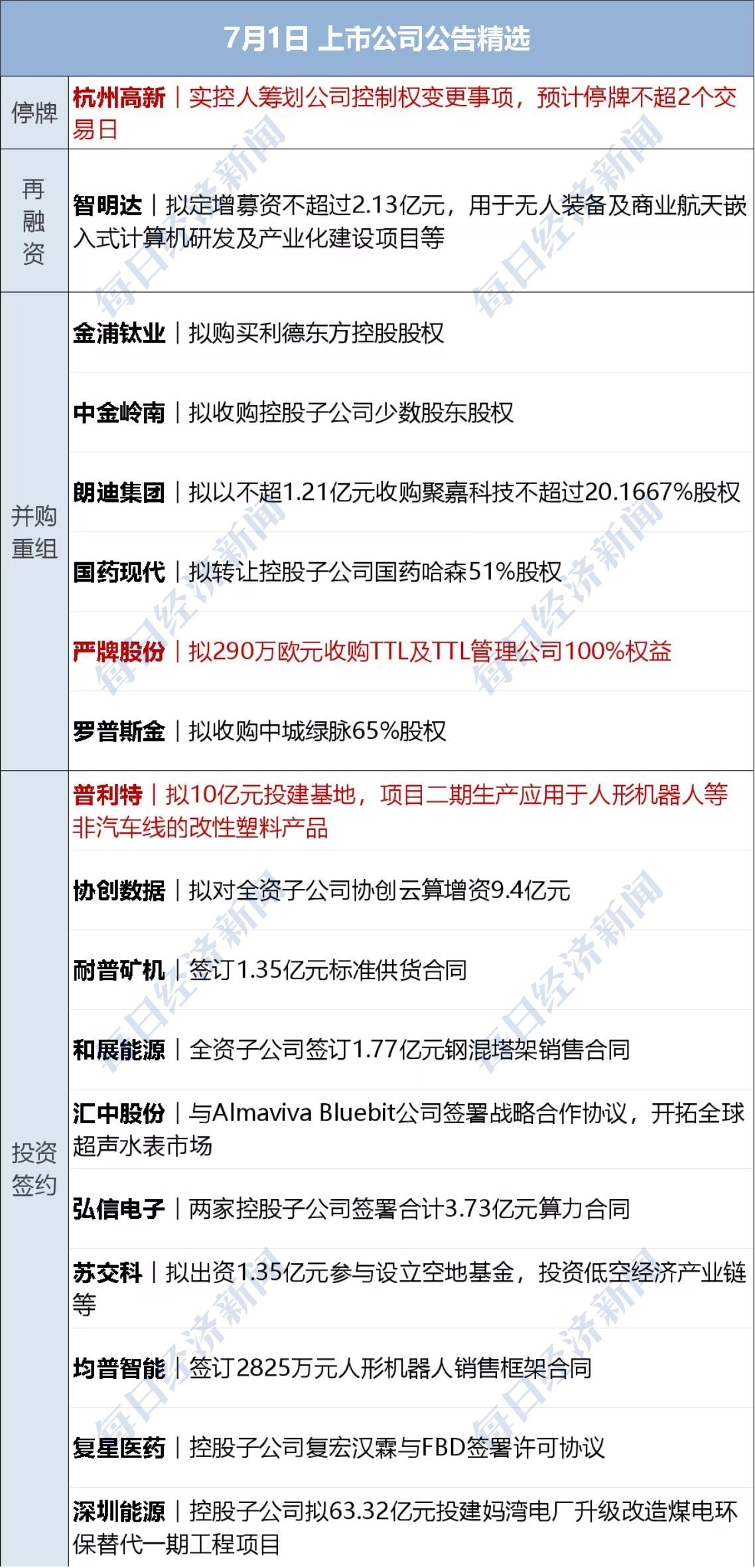 宁德时代(SZ300750,股价252.22元,市值1.15万亿元):据宁德时代官微消息,6月30日,宁德时代在赛力斯超级工厂的两条CTP 2.0高端电池包产线正式投产。这是宁德时代在重庆布局的首个基地,并首次采用“厂中厂”合作模式,为问界系列车型本地化生产供应动力电池系统。