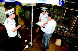 机场执法人员向养鸽居民发放《净空通知书》。 资料图片