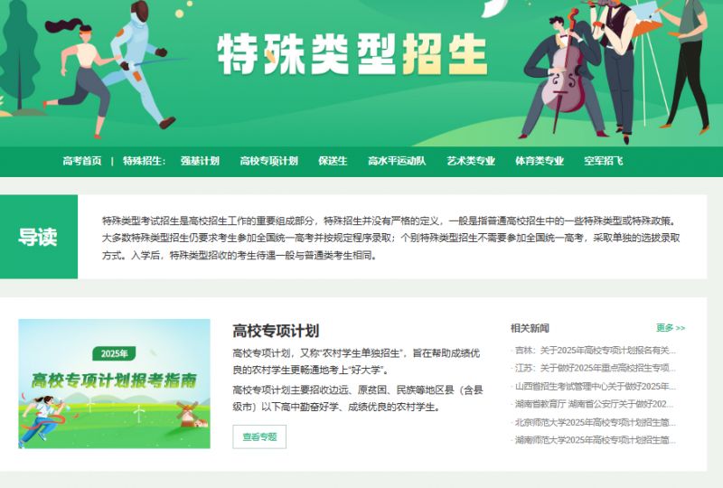“特殊类型招生专题汇总”板块涵盖强基计划、高校专项计划、保送生、高水平运动队、艺术类专业、体育类专业、港澳高校内地招生等报考专题,还发布空军招飞、海军招飞、民航招飞、公费师范生、免费医学生等招生政策。此外,阳光高考信息平台还有特殊类考生名单公示、选科指导、心理测评、职业前景、高考志愿填报指导等内容,满足不同类型考生了解政策、大学专业、职业等各方面的信息。